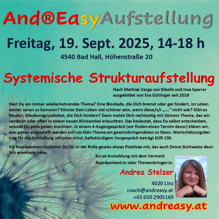 Es gibt noch Platz für ein Thema (€ 150,–) inklusive Vorgespräch (natürlich stehe ich auch für ein Nachgespräch zur Verfügung) und als Repräsentantin (€ 20–). Bitte melde Dich mit Angabe von Themenstellerin oder Repräsentantin mit Name, E-Mail + Telefon-Nr kurz an.